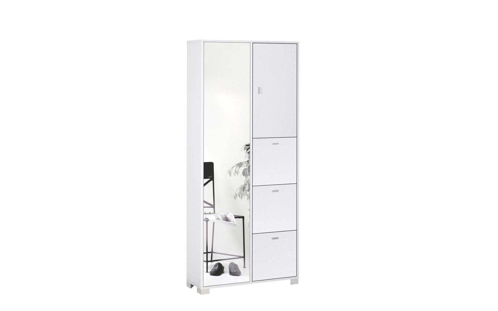 La struttura è divisa in due sezioni verticali. La parte sinistra presenta un’anta a specchio a tutta altezza, perfetta per controllare il proprio look prima di uscire. La parte destra è composta da un’anta battente superiore e 3 ante a ribalta specifiche per le calzature.