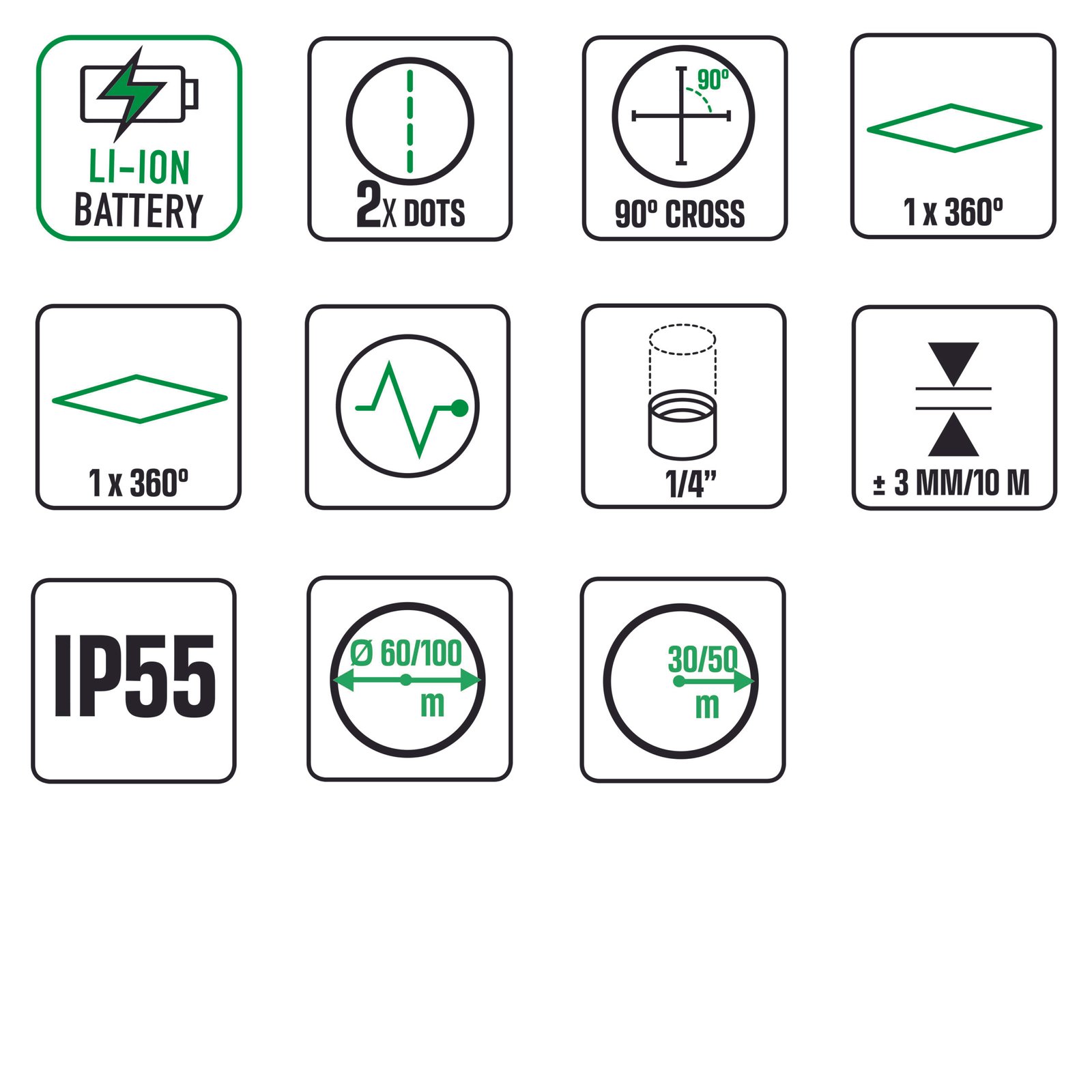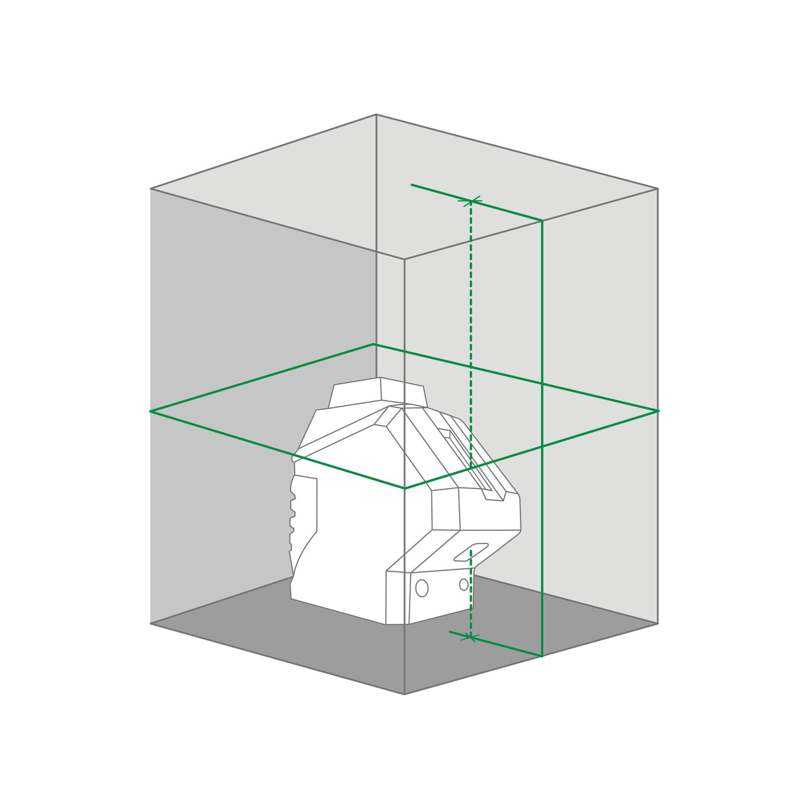 • Autolivello laser verde. Proietta: un piano orizzontale su 360 più un piano verticale formando 1 croce a parete, più 2 Punti (terra e soffitto) per il piombo