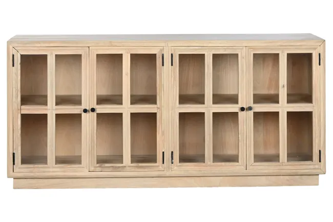 • Design: Il design combina lo stile rustico con la funzionalità moderna, caratterizzato da quattro ante con pannelli in vetro trasparente che permettono di esporre stoviglie o oggetti decorativi, proteggendoli dalla polvere. I telai delle ante e le maniglie ad anello sono in metallo nero per un contrasto elegante.