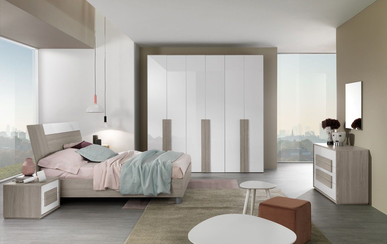 • Design Contemporaneo: Il mix di colori bicolore e le linee pulite conferiscono un aspetto elegante e attuale a tutta la stanza. Il letto presenta una testata con pannello inclinato, un dettaglio che aggiunge un tocco di design.