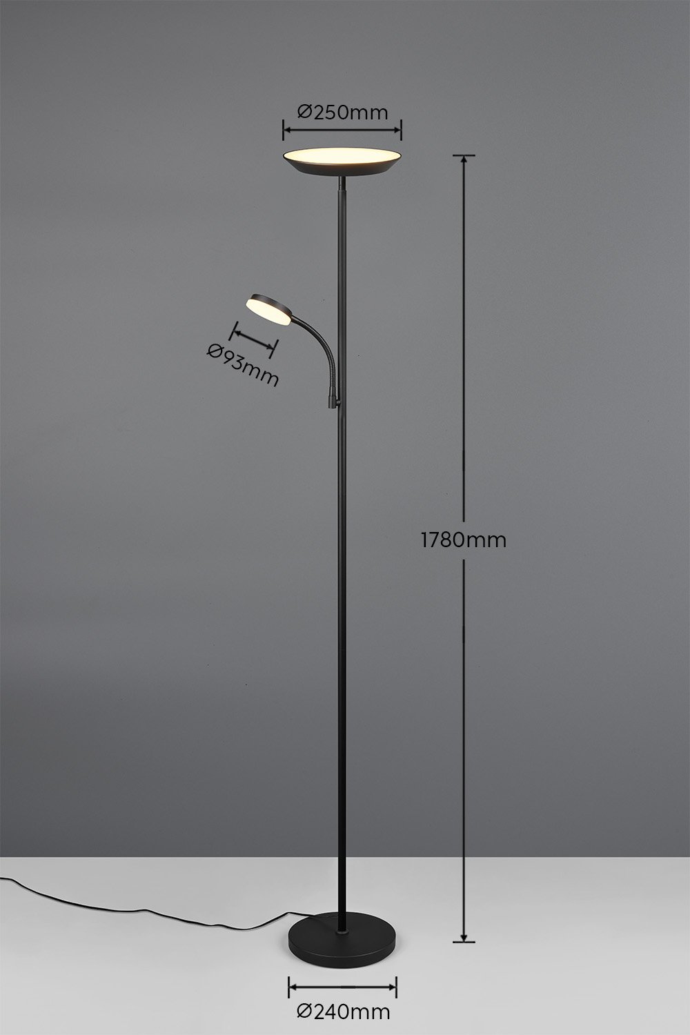 • Doppia Sorgente Luminosa: La piantana è dotata di due sorgenti luminose LED integrate e indipendenti: un proiettore (uplighter) per illuminare l’ambiente e un braccio di lettura orientabile e flessibile per una luce mirata.