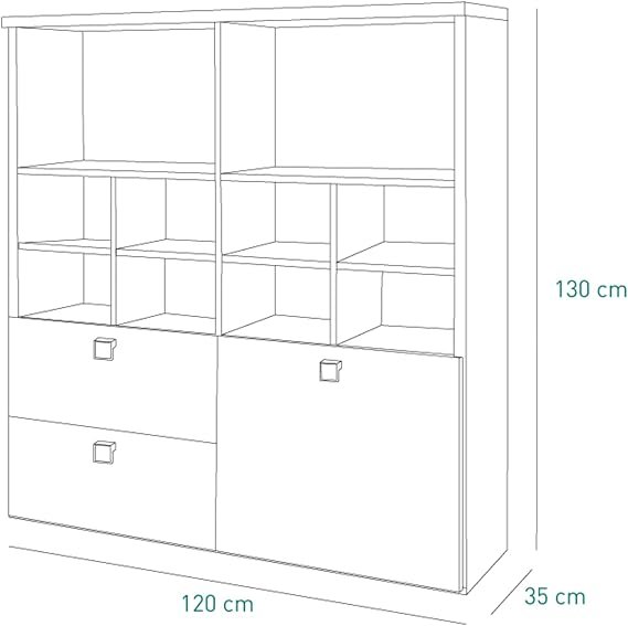 • Ampio Spazio Contenitivo: Offre una soluzione organizzativa versatile con una combinazione di vani a giorno, un’anta e due cassetti.