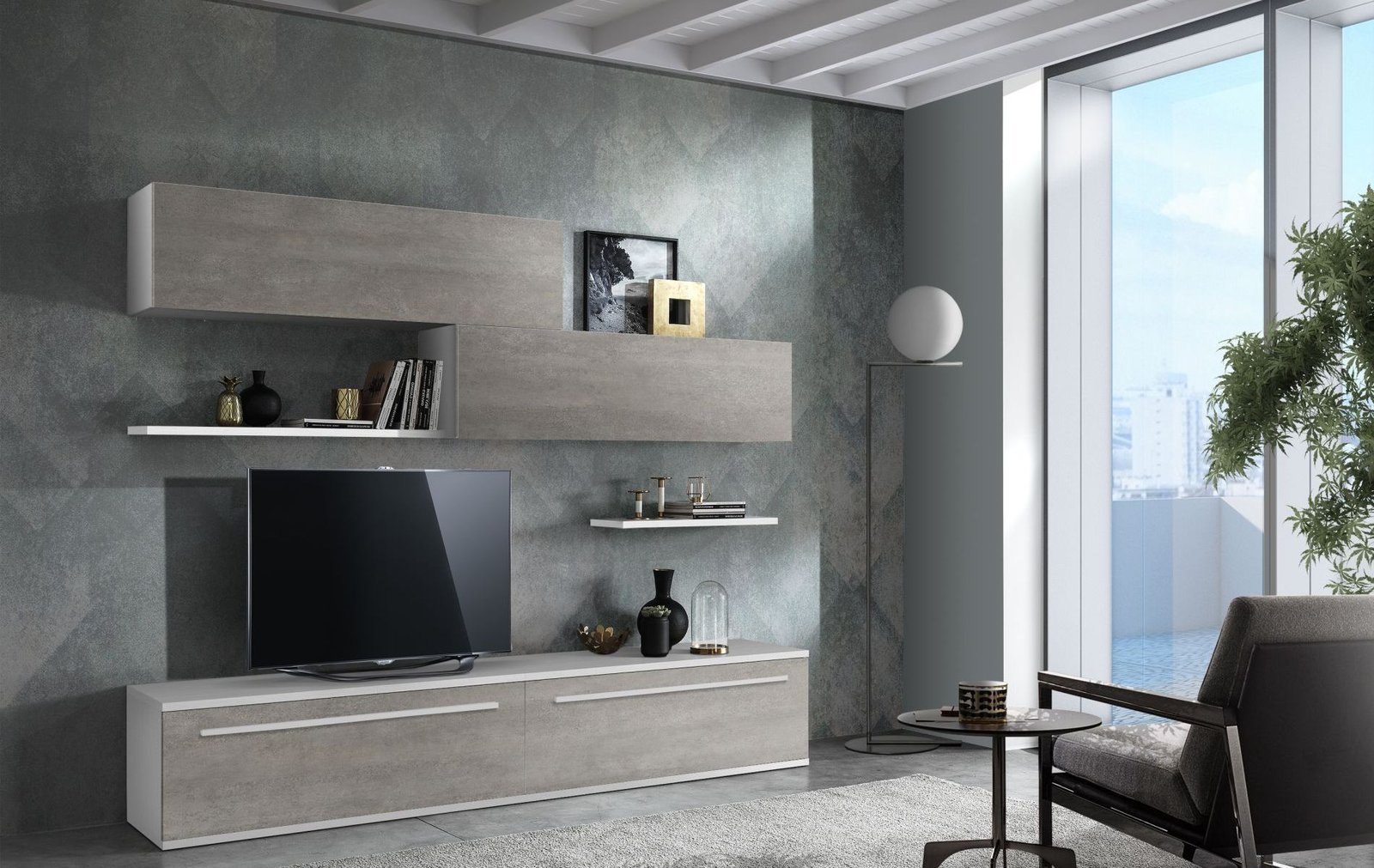 • Stile Bicolore Sofisticato: La composizione gioca sul contrasto tra la finitura materica effetto Cemento (o grigio resina scura) e il Bianco (opaco o lucido) dei pensili superiori e della base TV, creando un look industriale-chic di grande tendenza.