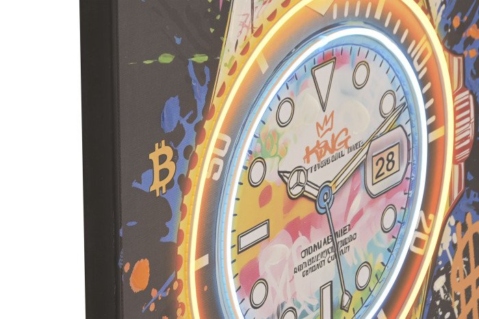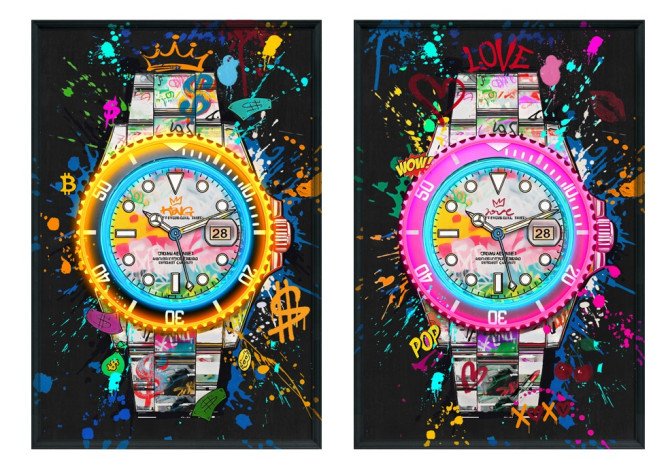 Ridefinisci il concetto di arte da parete con questo set esclusivo di quadri retroilluminati a LED. Al centro della scena, l’icona del prestigio — l’orologio sportivo di lusso per eccellenza — viene reinterpretato attraverso esplosioni di graffiti, stencil e colori fluorescenti, evocando un’estetica che mescola il mondo dei capitali con la libertà della strada.