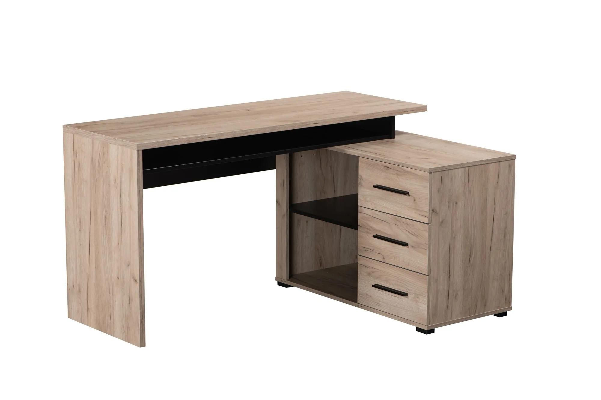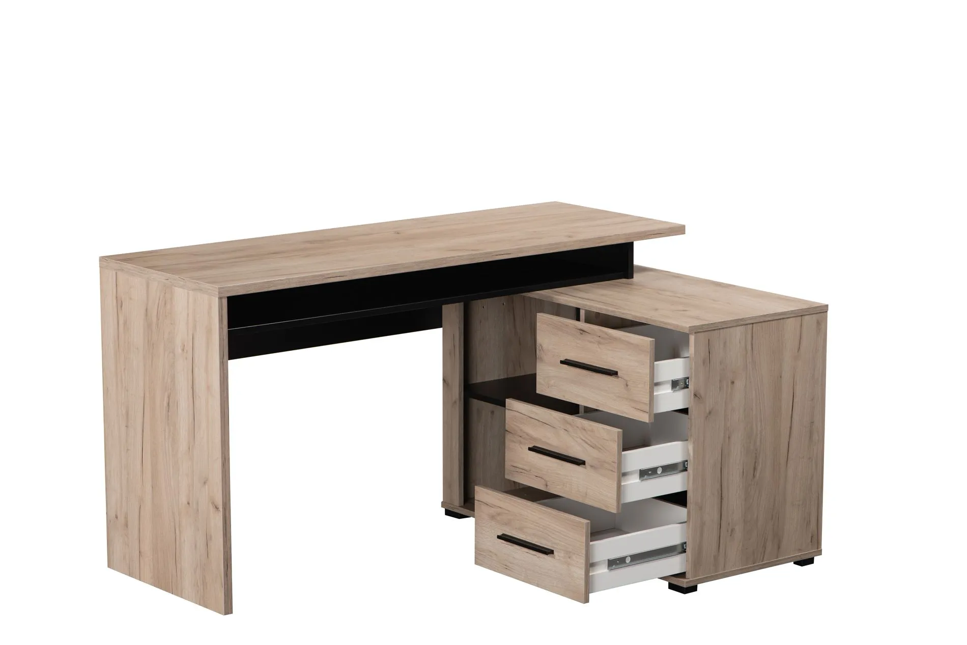 • Archiviazione Integrata: La scrivania è dotata di un pratico mobiletto laterale che include tre cassetti e due vani a giorno (o nicchie), perfetti per organizzare documenti, libri e materiali di cancelleria, mantenendo il piano libero e ordinato.