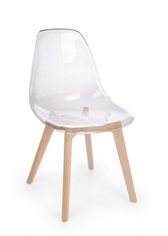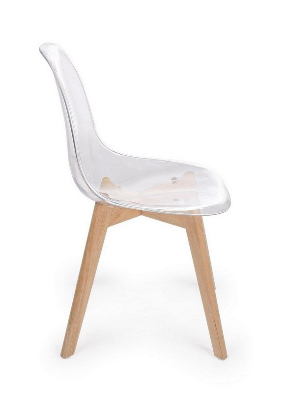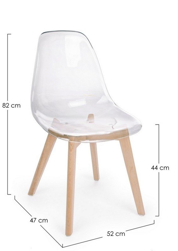 • Materiali di Qualità: La seduta e lo schienale sono realizzati in resistente policarbonato (PC) trasparente, un materiale leggero e facile da pulire. Le gambe sono in robusto legno di faggio naturale.