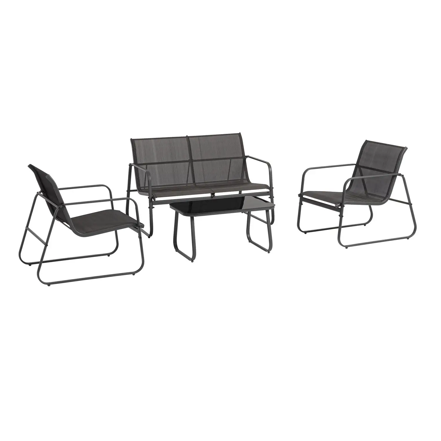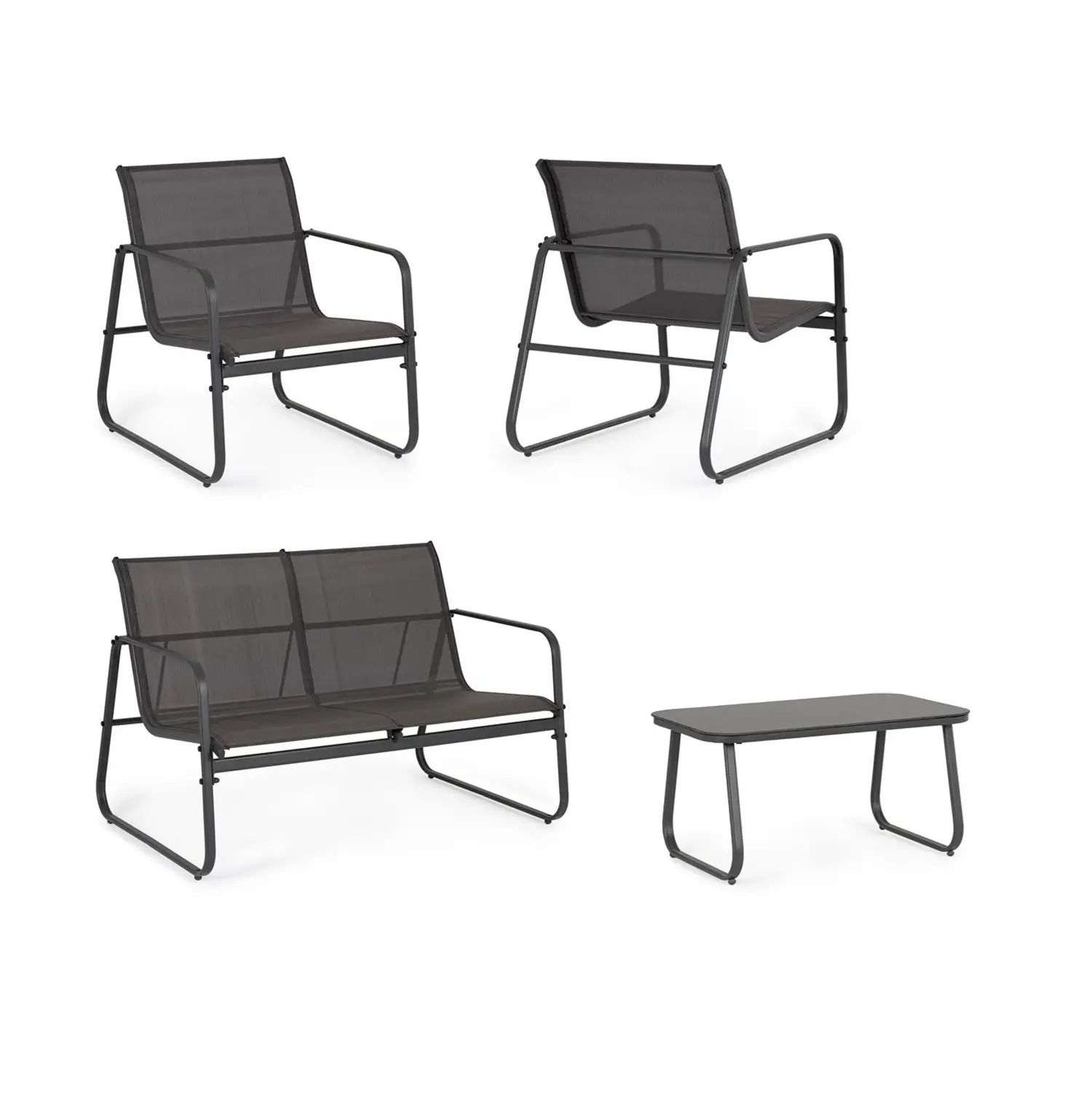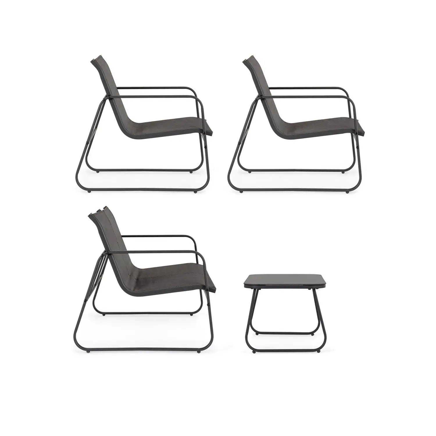 Grazie all’utilizzo del textilene per le sedute e gli schienali, il set garantisce un’ottima traspirabilità e un comfort immediato senza la necessità di cuscini aggiuntivi, rendendolo estremamente facile da pulire e rapido ad asciugarsi dopo la pioggia. La robusta struttura in metallo verniciato assicura stabilità e resistenza agli agenti atmosferici, mentre le linee squadrate e i materiali tecnici lo rendono perfetto per arredare con uno stile industriale e contemporaneo balconi, terrazzi o zone bordo piscina, ottimizzando lo spazio senza appesantire l’ambiente.