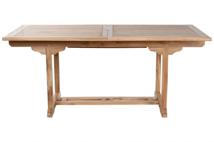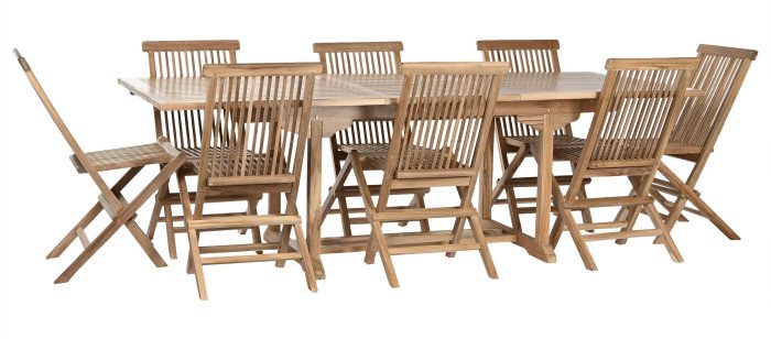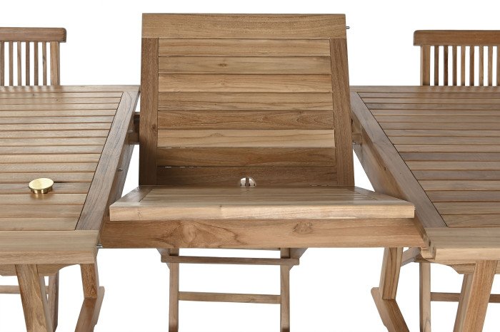 Il tavolo è caratterizzato da un piano a doghe con un pratico meccanismo di estensione centrale che permette di modulare lo spazio a seconda degli ospiti, sostenuto da una solida struttura con traversa inferiore per la massima stabilità. Le otto sedie incluse presentano uno schienale a listelli verticali dal design ergonomico e, grazie alla loro struttura completamente pieghevole, possono essere riposte con il minimo ingombro quando non utilizzate.