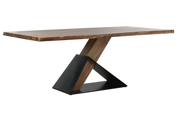 • Base Geometrica: Il design audace e contemporaneo è completato da una base a piedistallo con un’iconica forma a “Z” o a parallelogramma, che combina sapientemente sezioni in legno con inserti e una solida piastra di base in metallo nero verniciato. Questa base non solo offre stabilità, ma aggiunge anche un forte tocco industriale chic.
