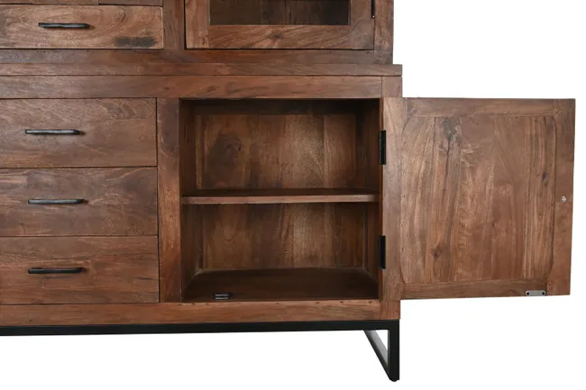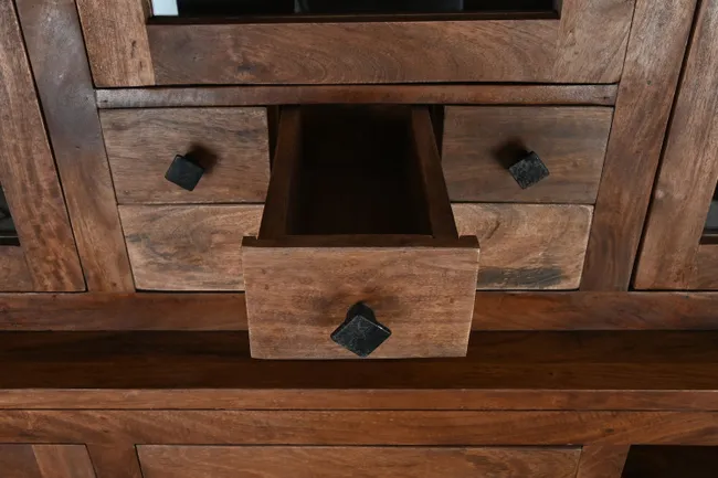 • Design Unico: Presenta tre sezioni superiori con ante in vetro per l’esposizione, mentre la parte inferiore offre ampio spazio di stoccaggio con ante in legno e cassetti, caratterizzati da disegni geometrici intagliati.